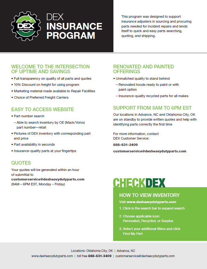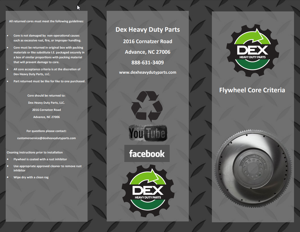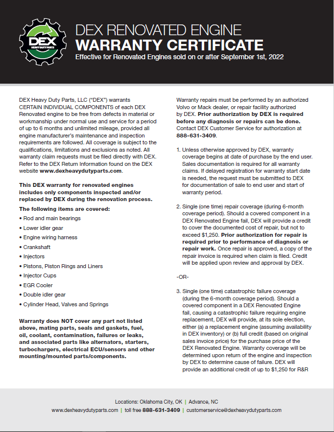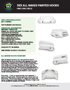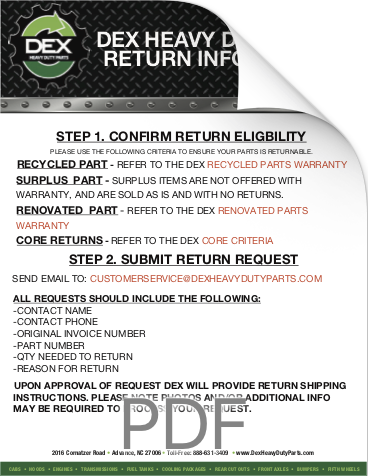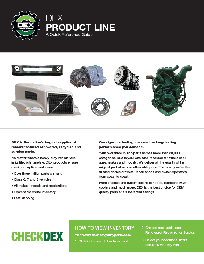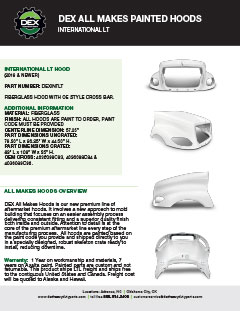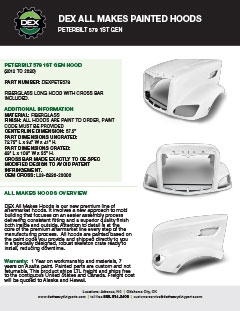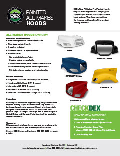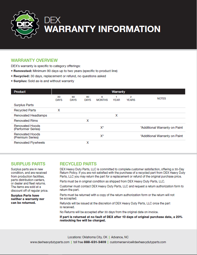 Downloads General Documents Visitor Guide - North Carolina Facility Visitor Guide - Oklahoma City Facility Good Better Best Website Descriptions Flywheel Core Guide Insurance Program & Repair Shop Sign Up Form Product Sheet - Surplus Parts Quick Reference Guide - Product Lines Renovated AMT Transmission Product Sheet Painted All Makes Hoods All Makes Hoods Overview Freightliner Hoods Hino Hoods International Hoods Kenworth Hoods Peterbilt Hoods Warranty Info DEX Return Information Warranty - Information Manual Warranty - Renovated Engine - Sold After Sept 1st 2022 DEX Renovated Transmission Warranty